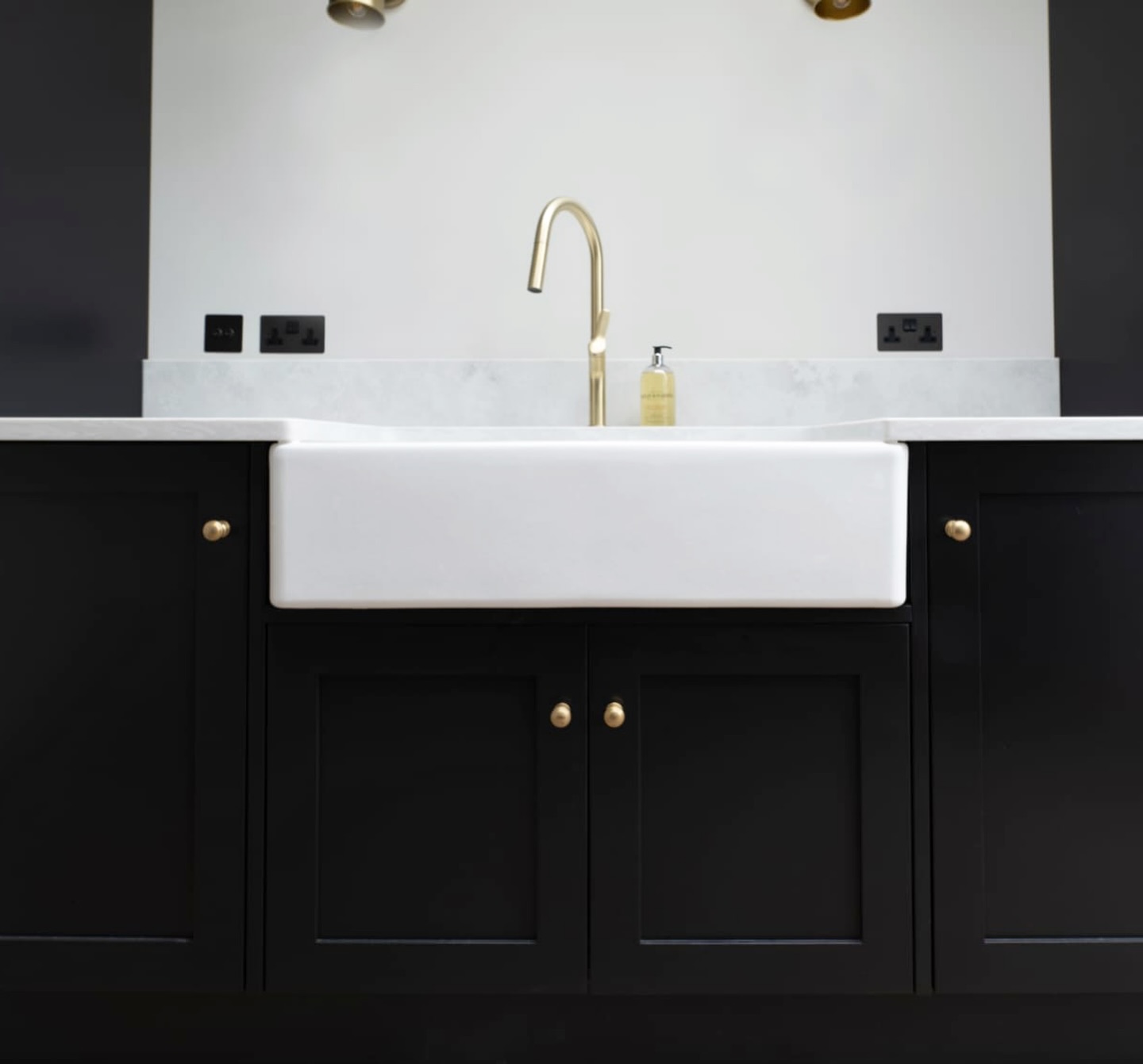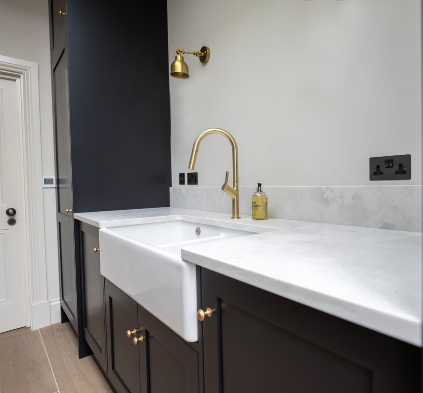 🤍With a Butler Sink as the focal point, smooth curves cut around the edges in quartz to show elegance and sophistication. Function and beauty working seamlessly together in this unique space.
